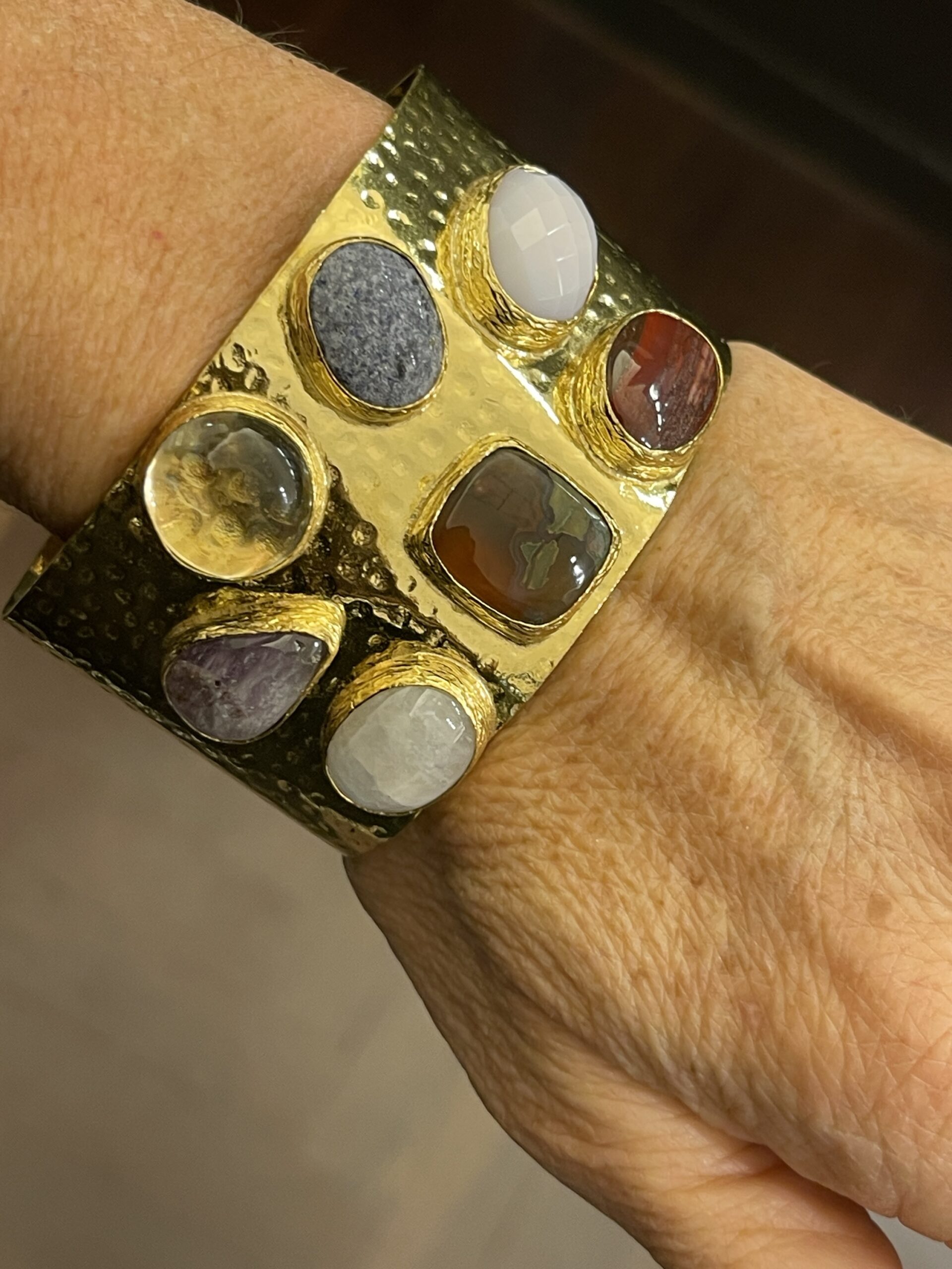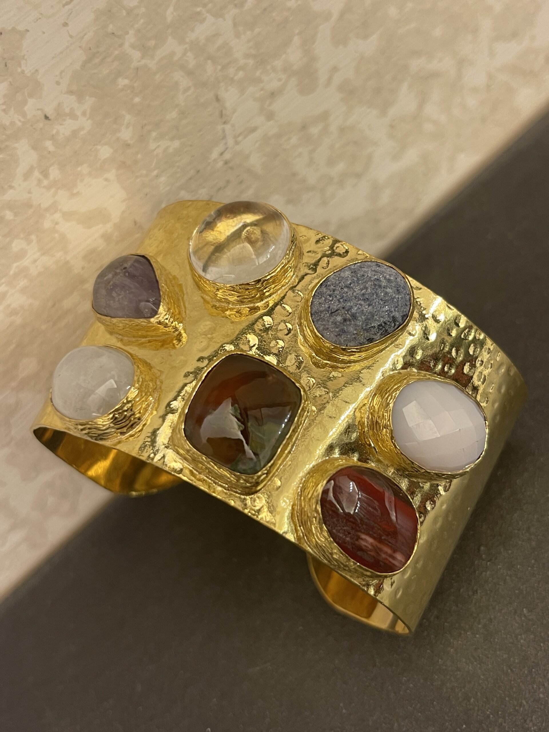 Bracciale altezza 4 cm in ottone martellano con pietre naturali bagnato oro 18 kt giallo
