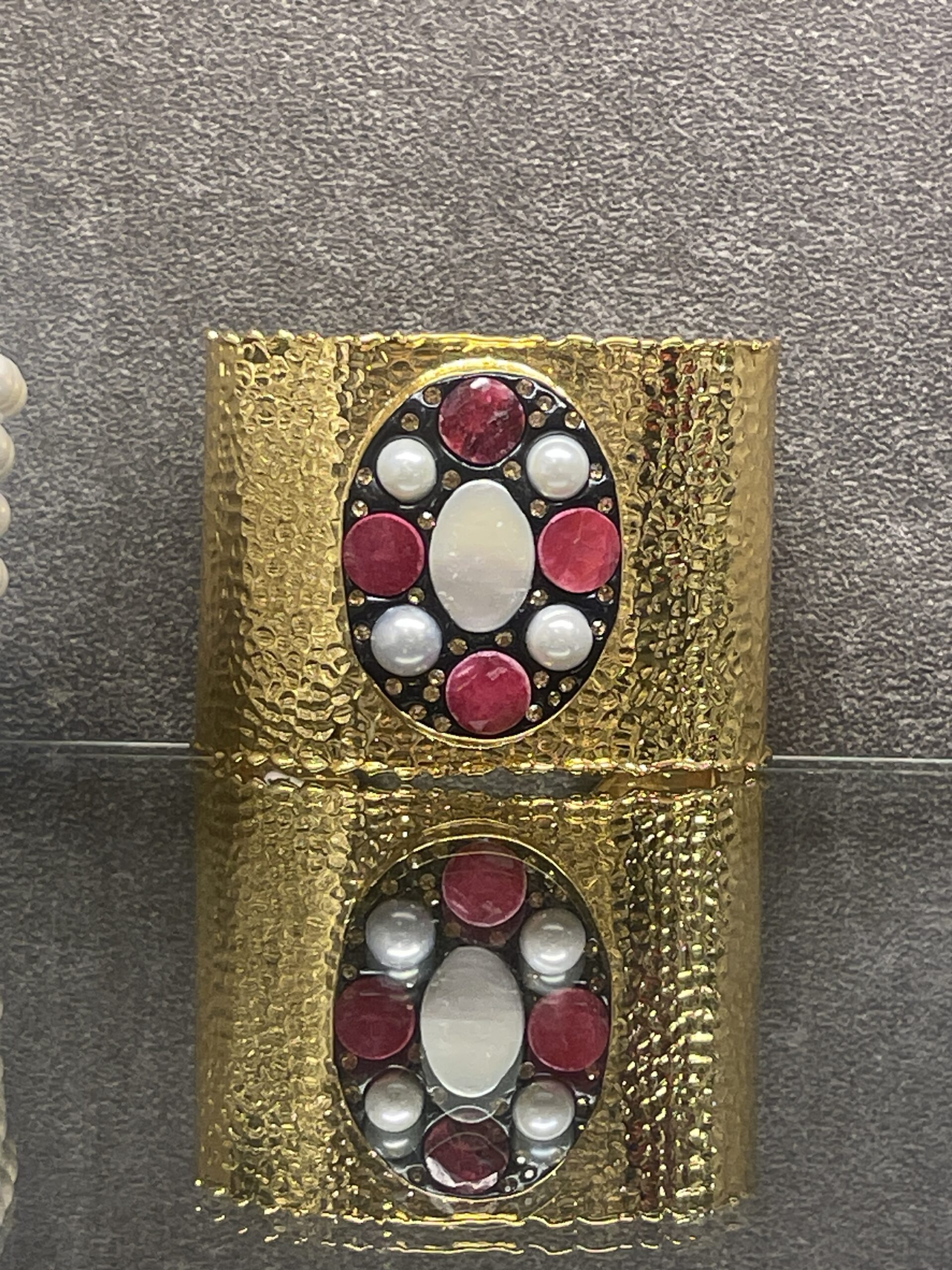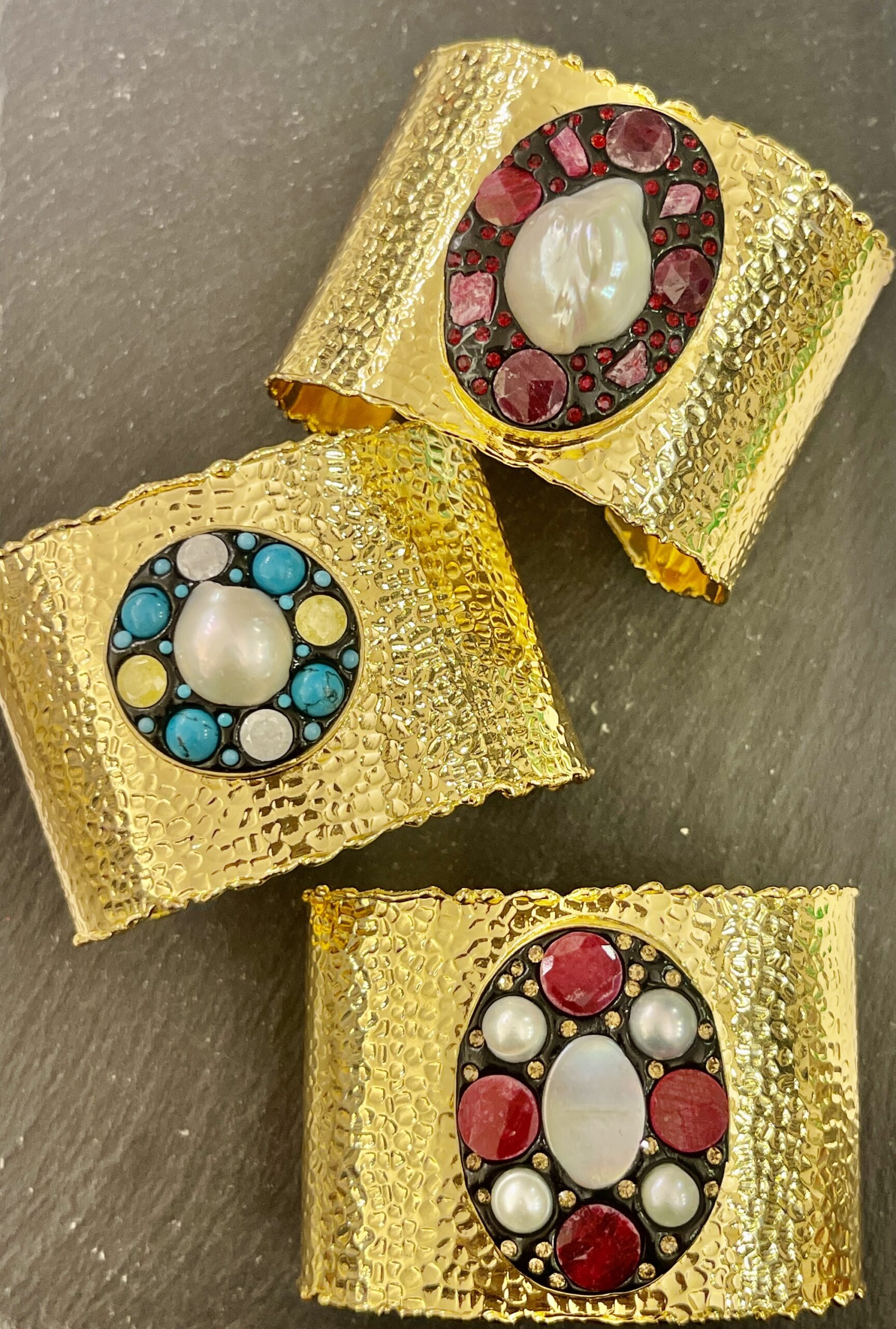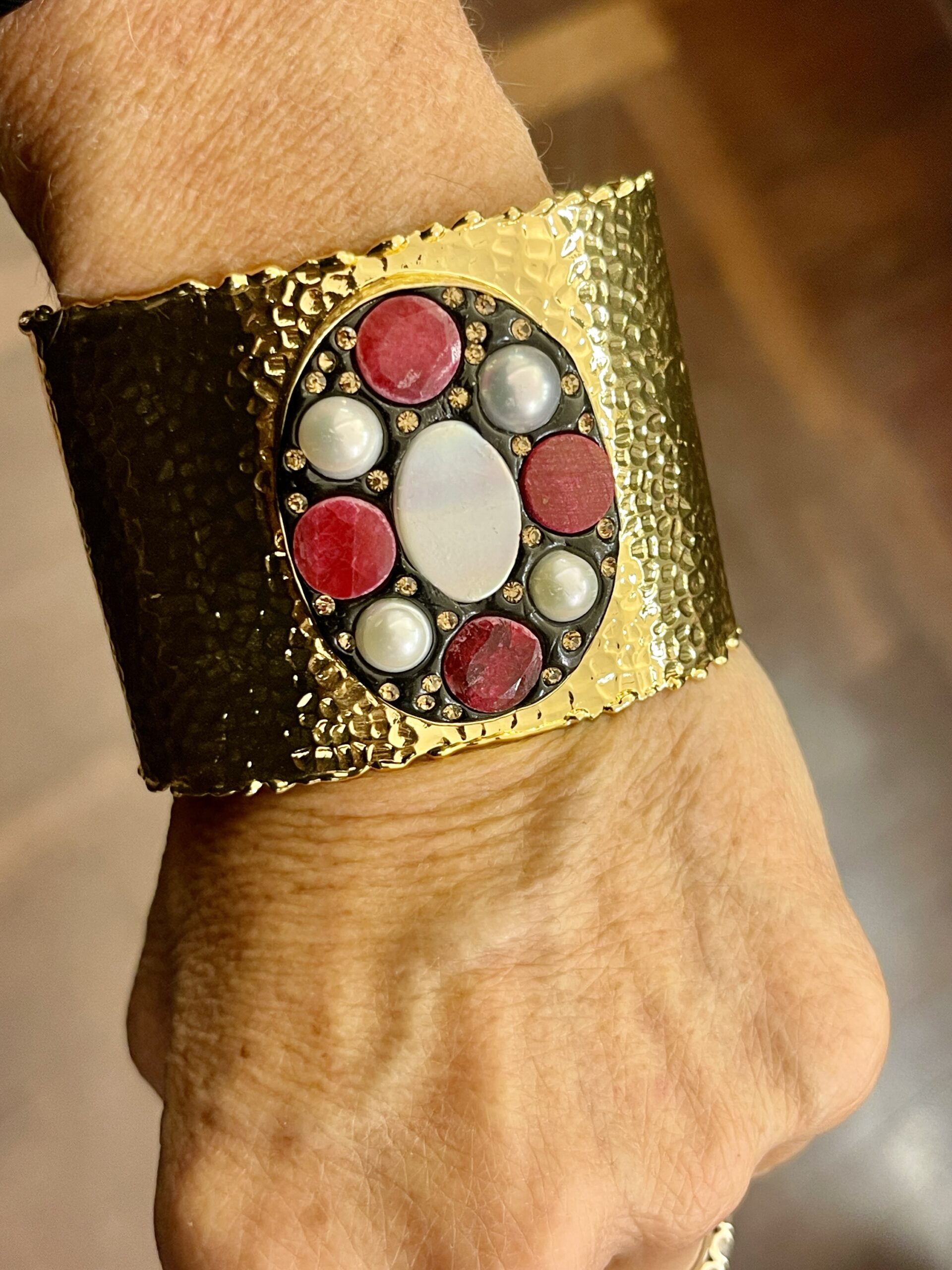 Bracciale rigido alto cm 5 in ottone martellato con inserto in perle naturali e radici di rubino