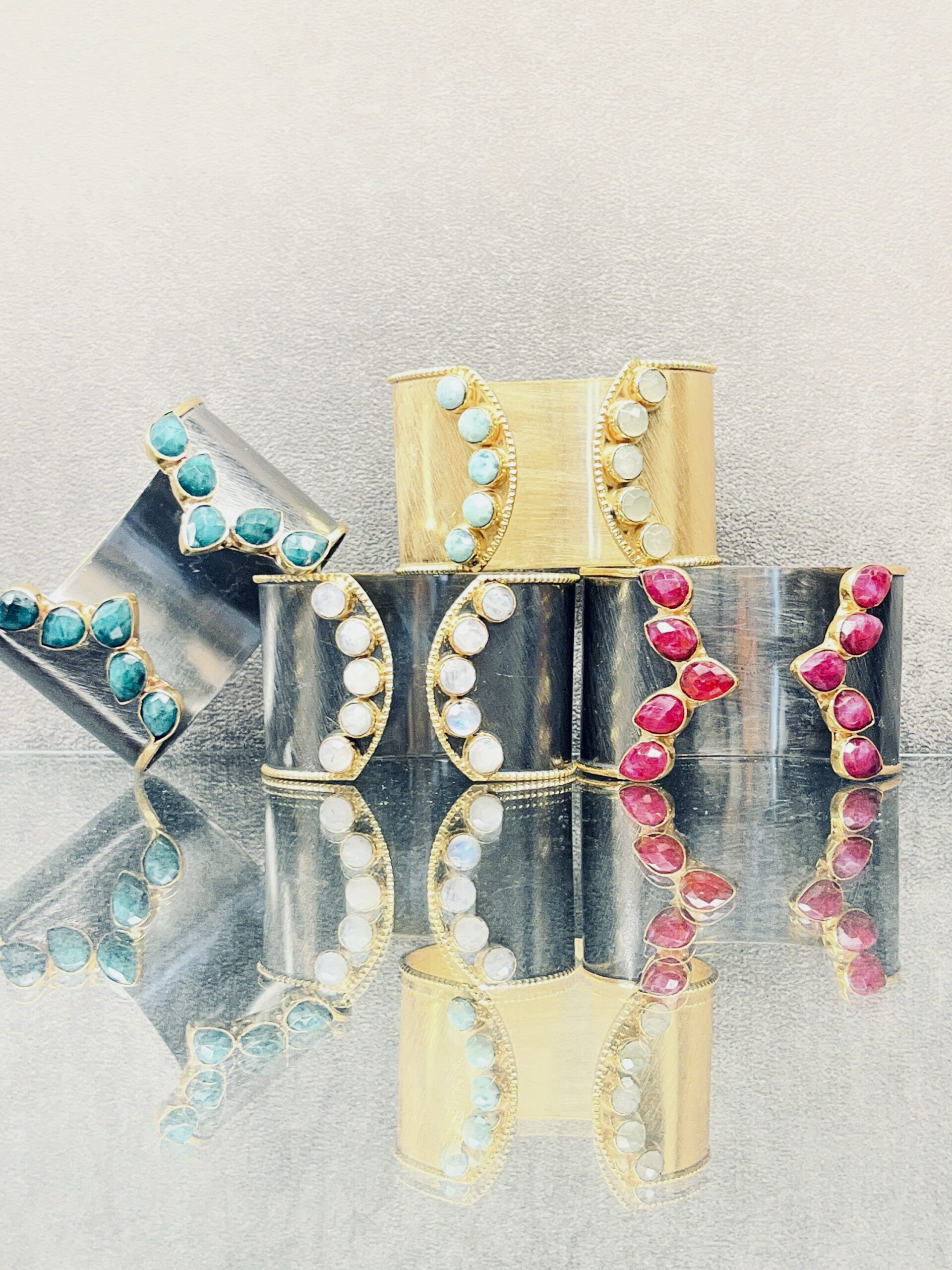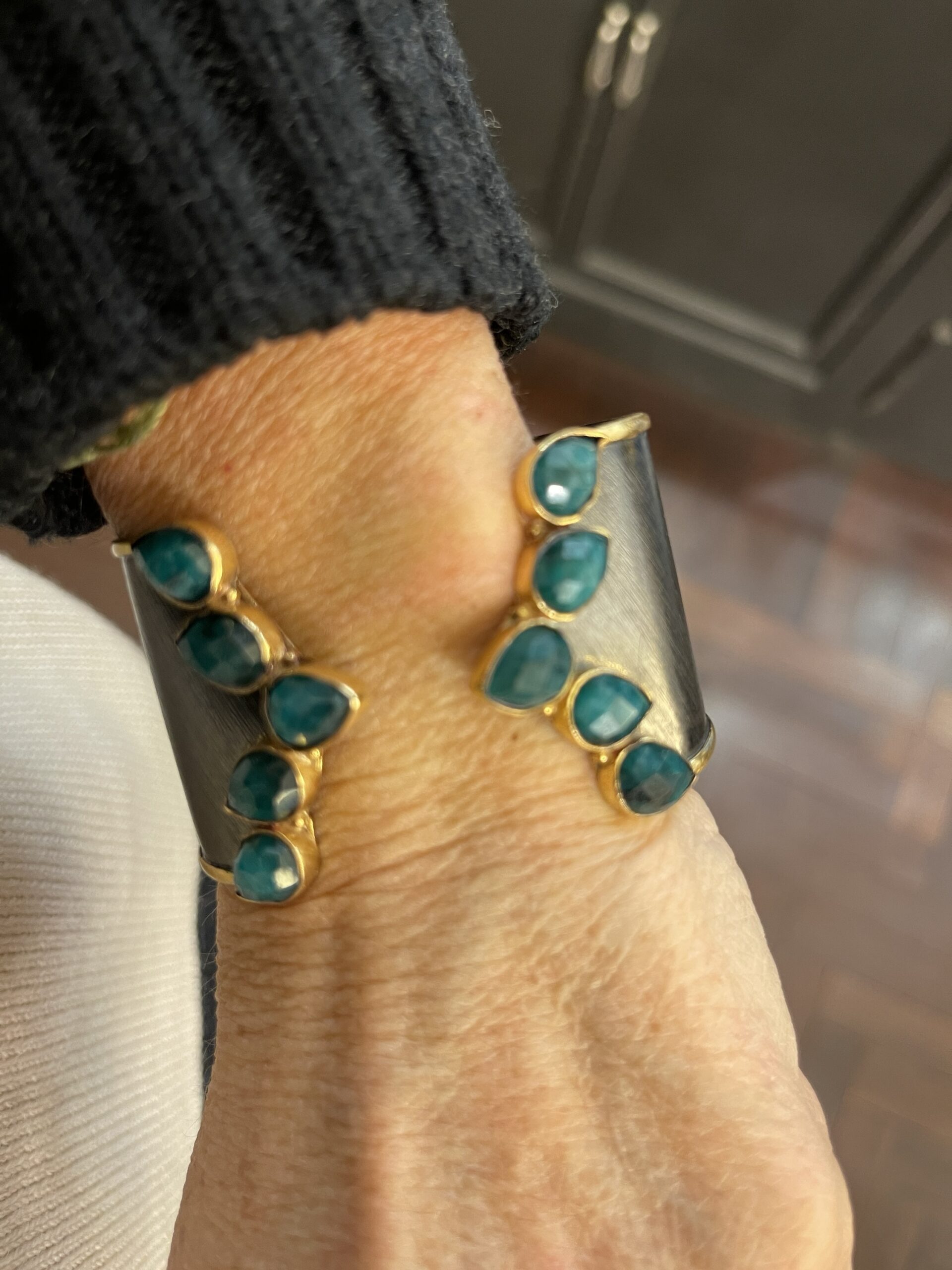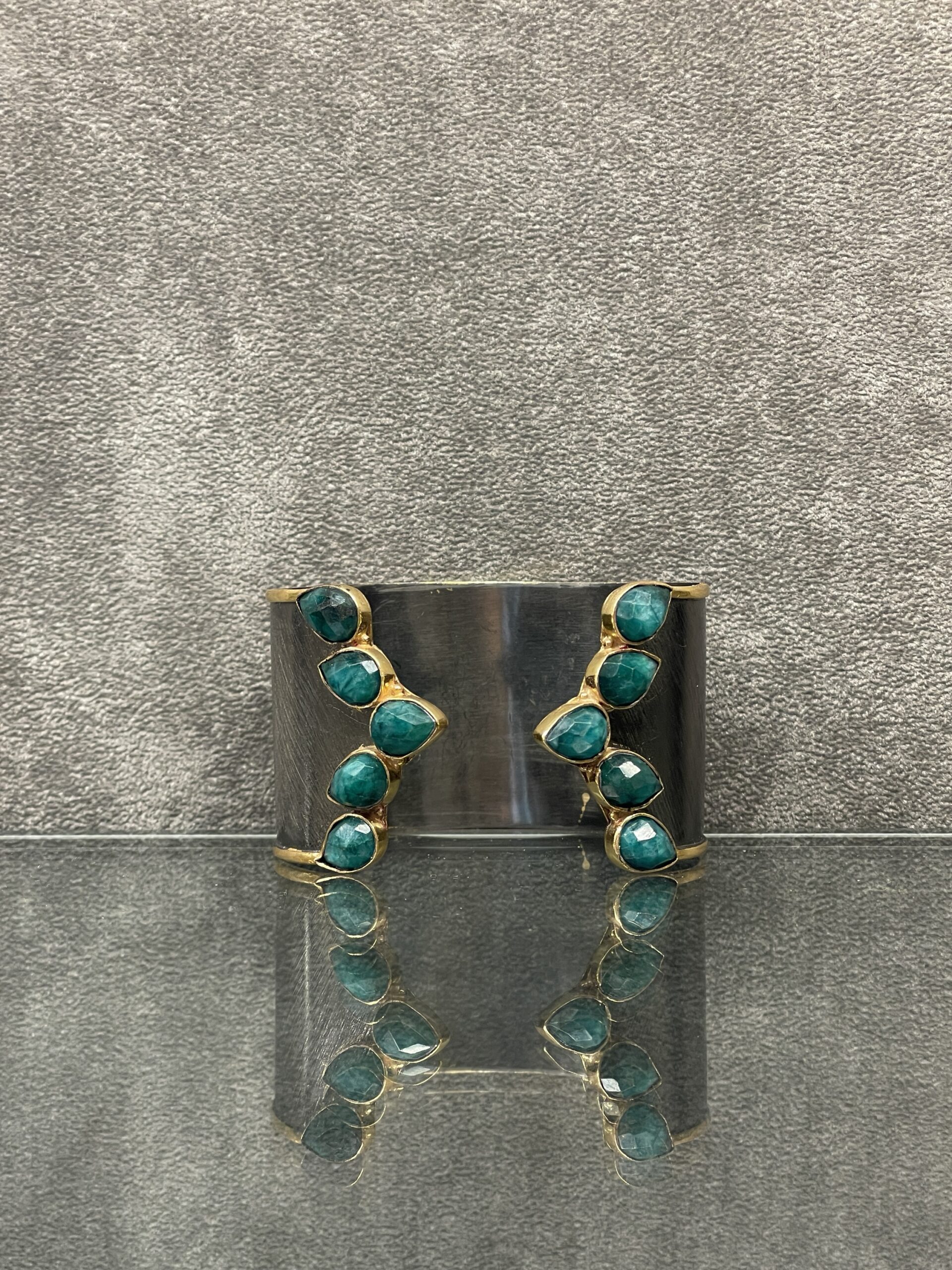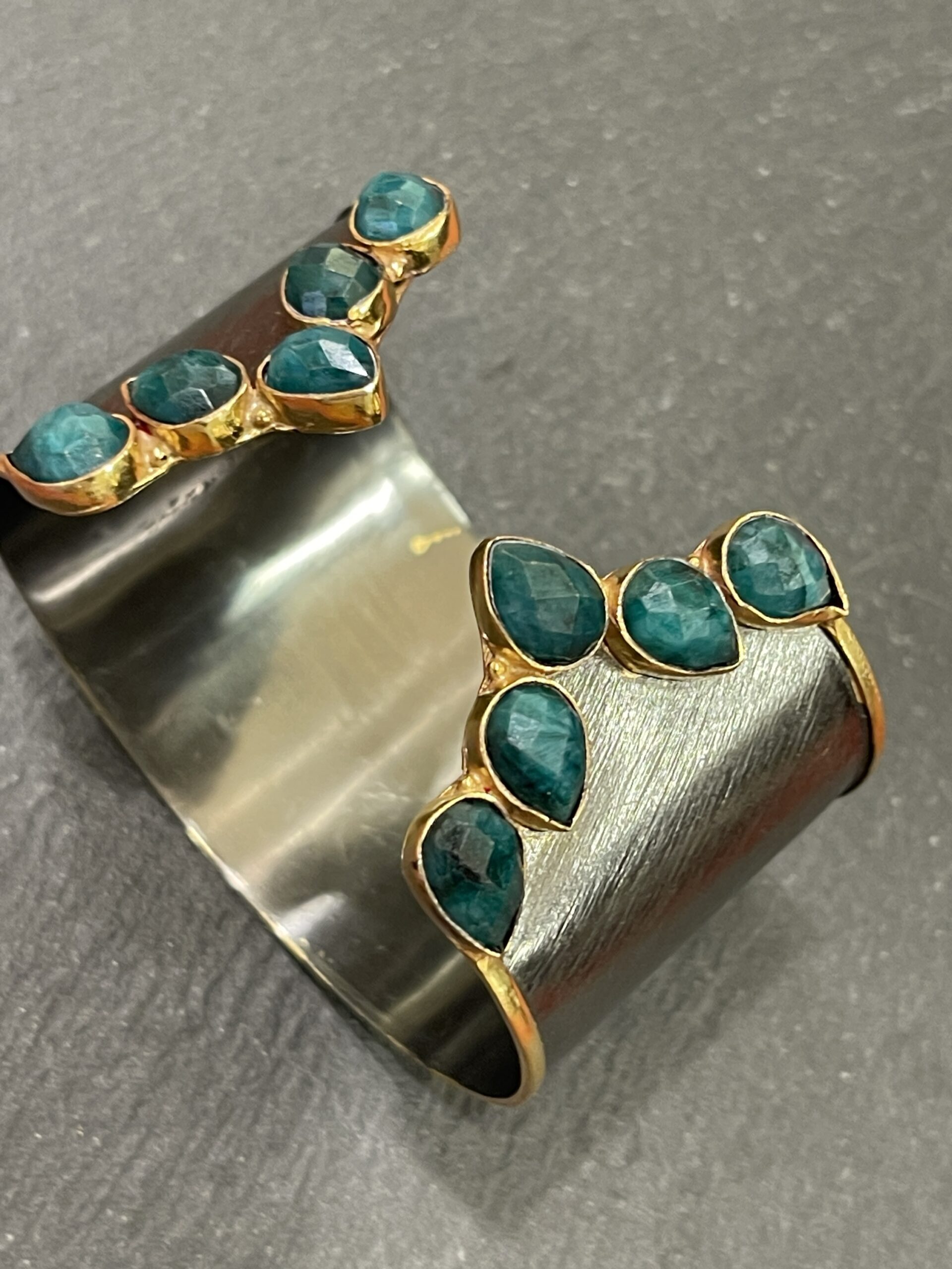 Bracciale in ottone galvanizzato in oro grigio e bagnato in oro giallo adattabile al polso con radici di smeraldi nella parte centrale