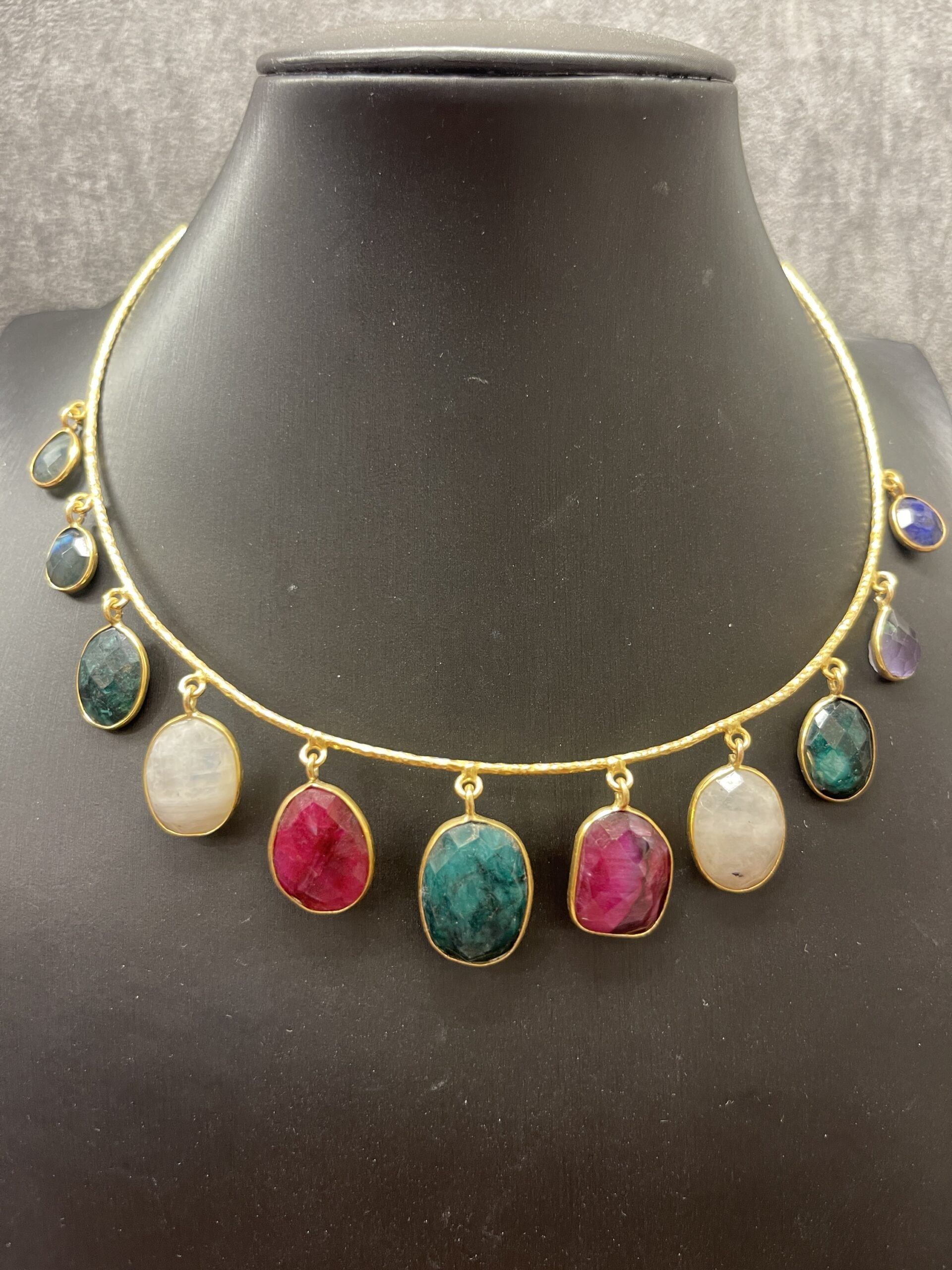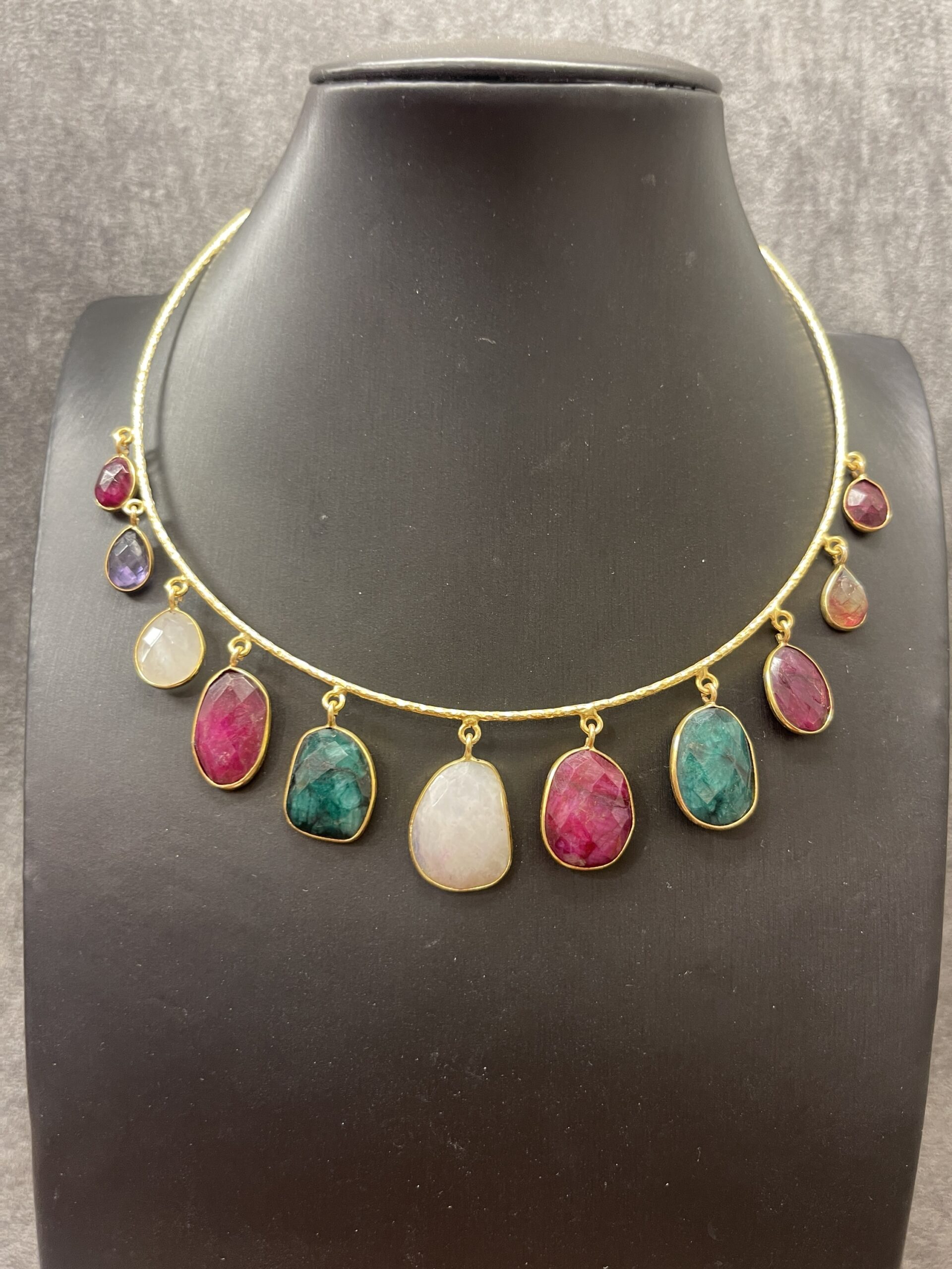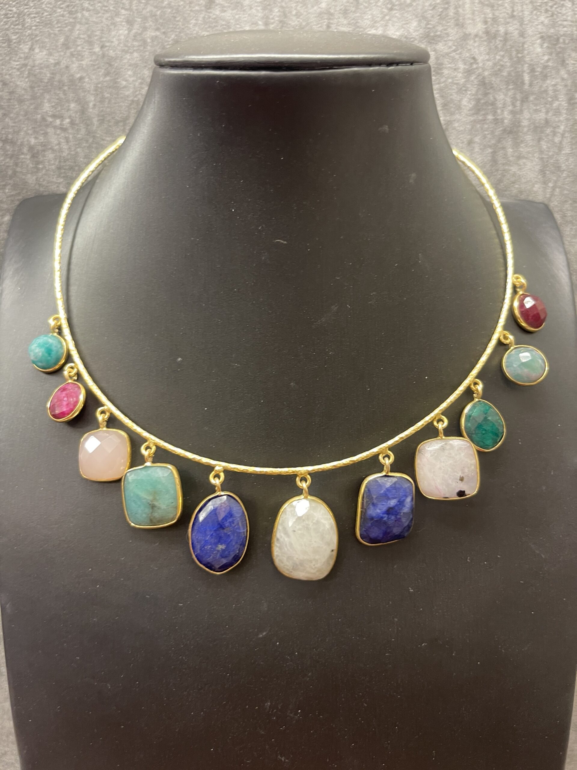 Choker in ottone bagnato in oro gialla 18 kit nikel free con ciondoli in zaffiri naturali flat multicolor
