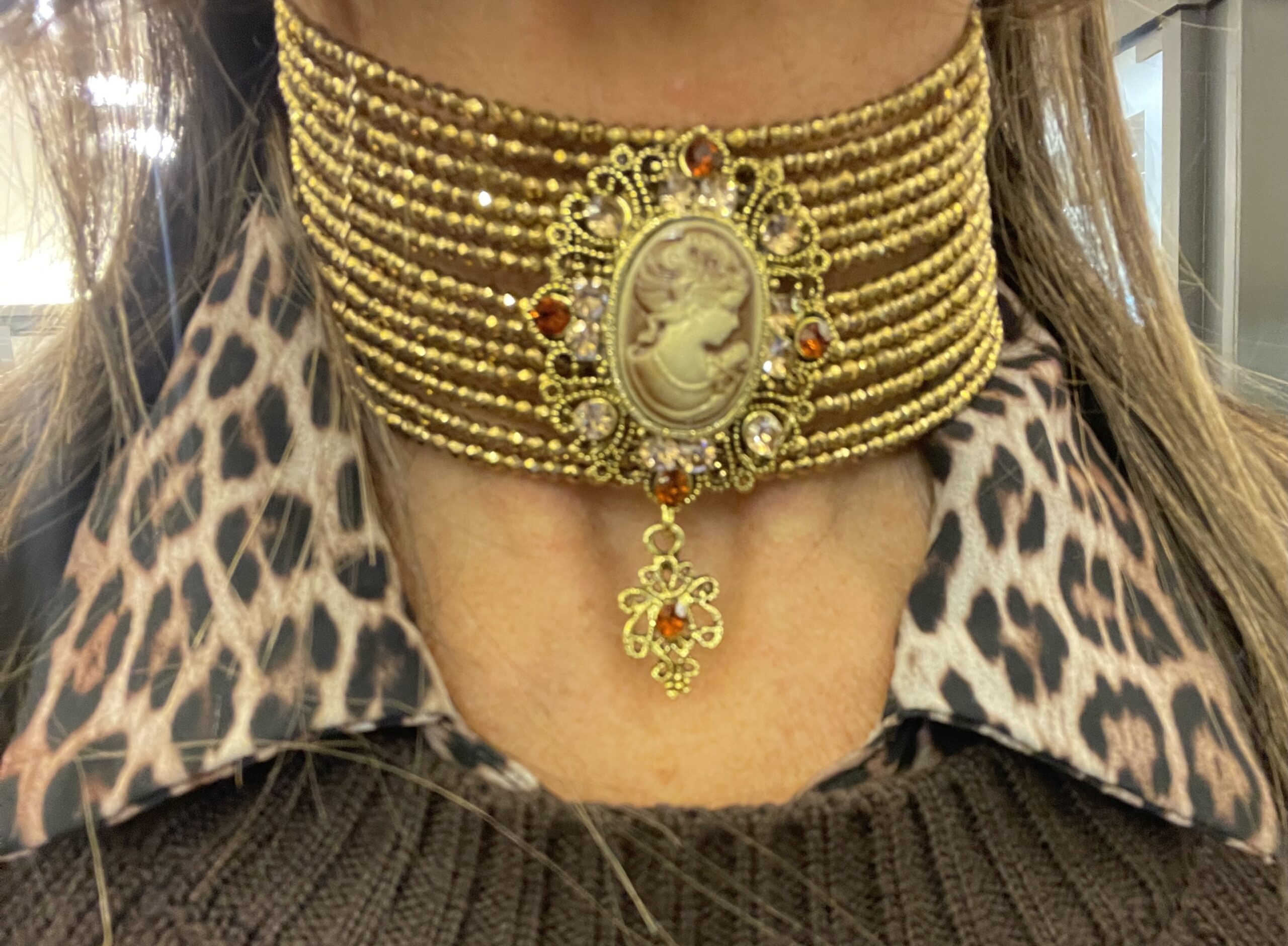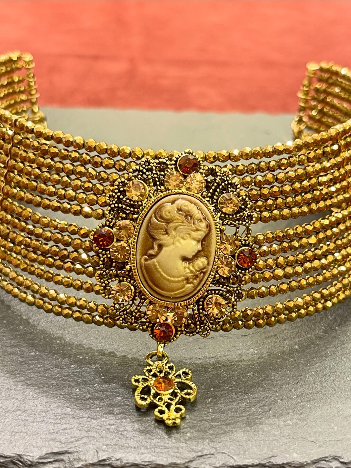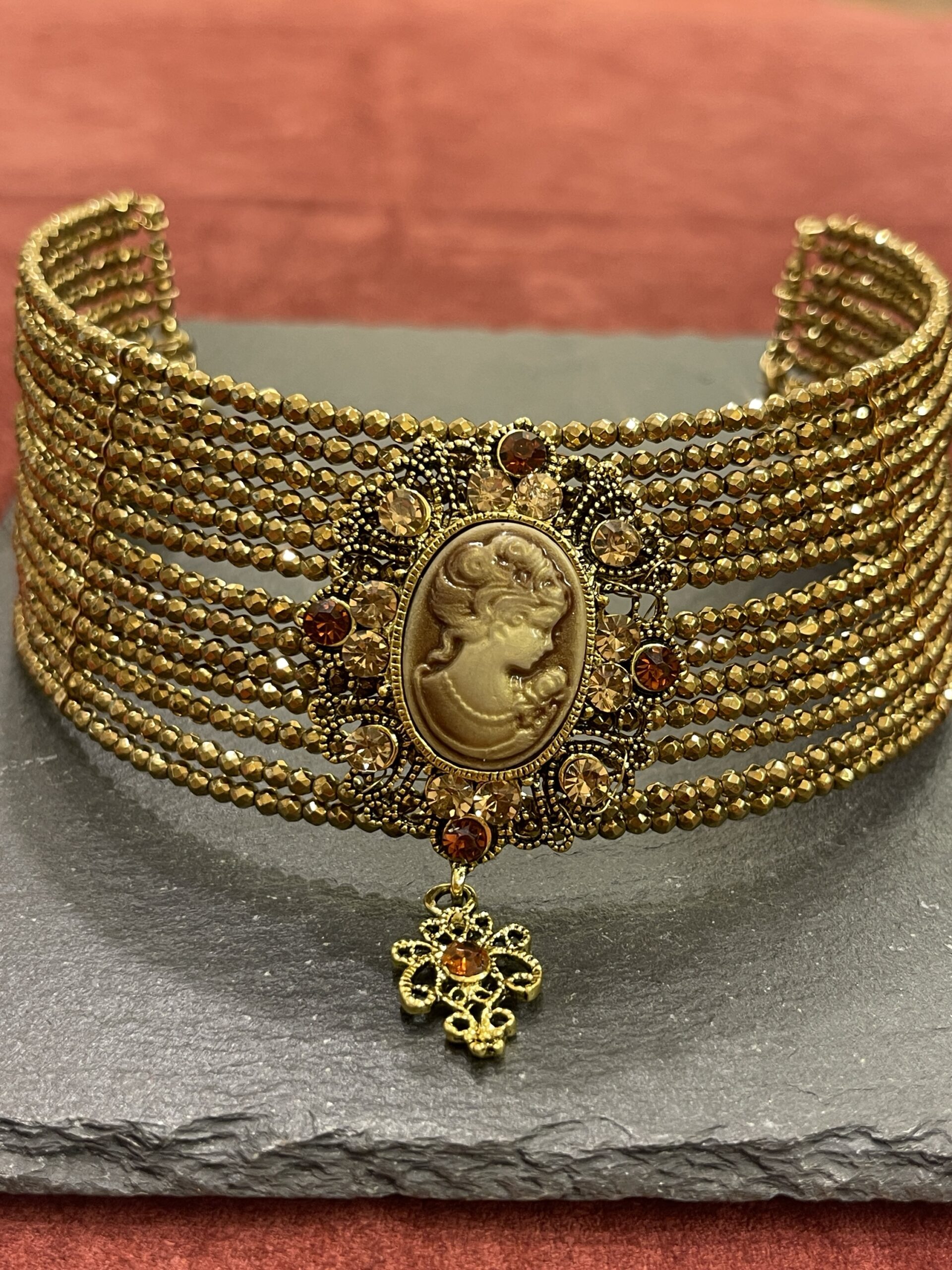 Collarino in ematite con applicazione cameo fatto a mano in bronzo