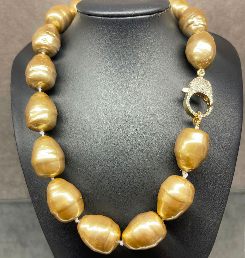Questa collana è composta da Perle di Maiorca Gold, note per la loro eccezionale uniformità e il lustro profondo, che conferisce un aspetto sontuoso e classico. Il filo è impreziosito da una lavorazione “gold” che ne aumenta la ricchezza visiva, mentre la chiusura bijoux è il punto focale del design. Questa chiusura, sapientemente incassata di scintillanti Zirconi, trasforma un elemento funzionale in un dettaglio prezioso, aggiungendo un tocco di glamour discreto. Con la sua lunghezza di 40 cm, si adagia perfettamente alla base del collo, ideale per look sofisticati.