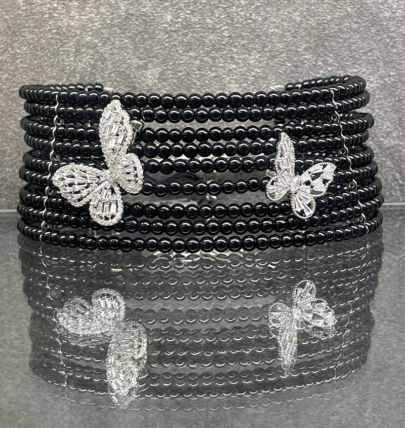 Questo collarino è composto interamente da Onice lucida, il nero intenso della gemma fornisce una base elegante che fa risaltare ogni dettaglio. Il design celebra la leggerezza con luminose Farfalle in inserti bijoux, sapientemente tempestate da Zirconi scintillanti. Il motivo a farfalla, simbolo universale di libertà e rinascita, dona al pezzo un tocco di gioiosa femminilità e movimento. Ogni elemento è fatto a mano, garantendo un’attenzione unica ai dettagli. Pensato per essere indossato aderente al collo (altezza 5,5 cm), il gioiello è Nickel Free e regolabile.