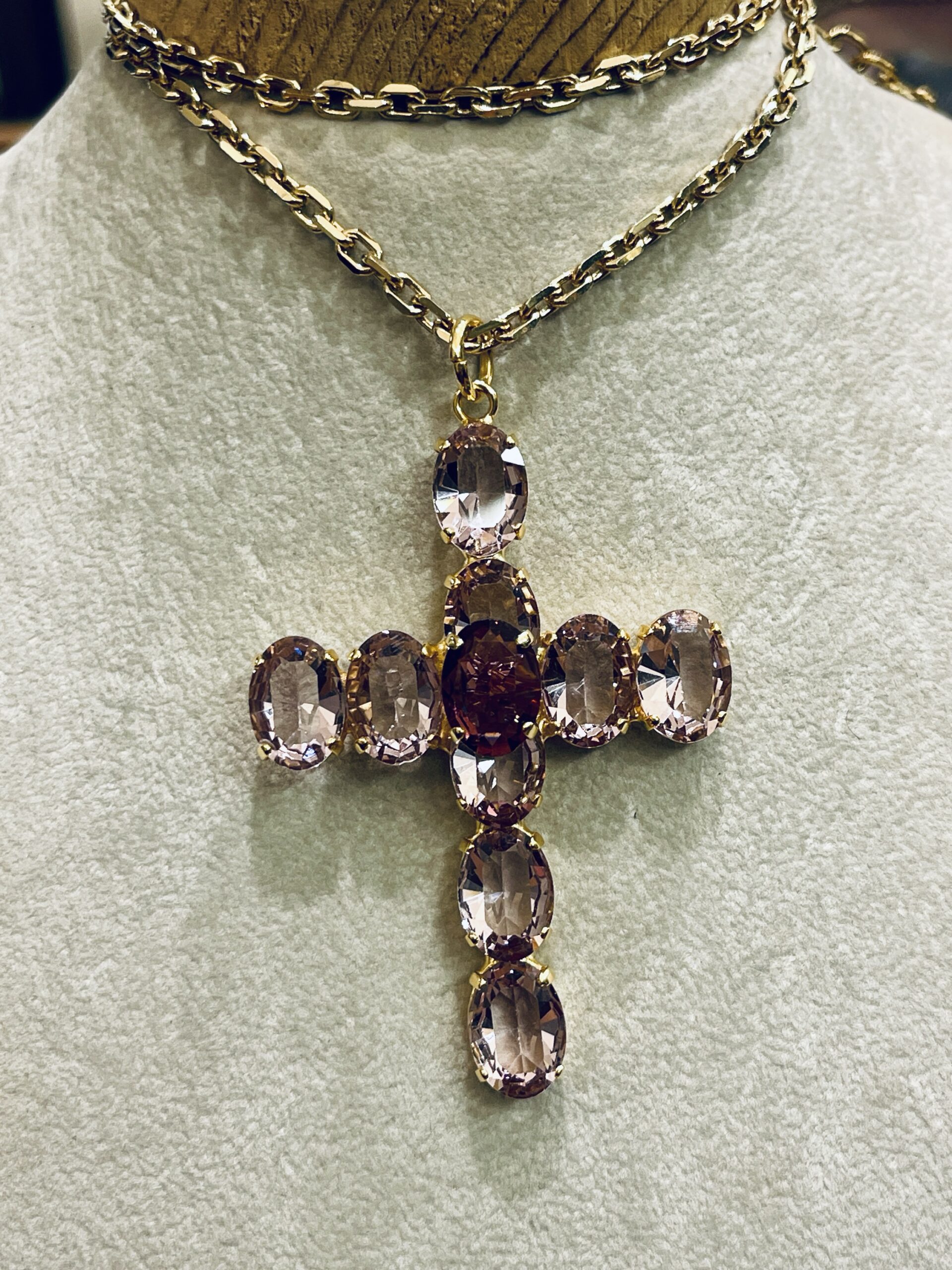 Collana in bronzo bagno oro giallo con croce in pietre semi preziose ametiste naturali