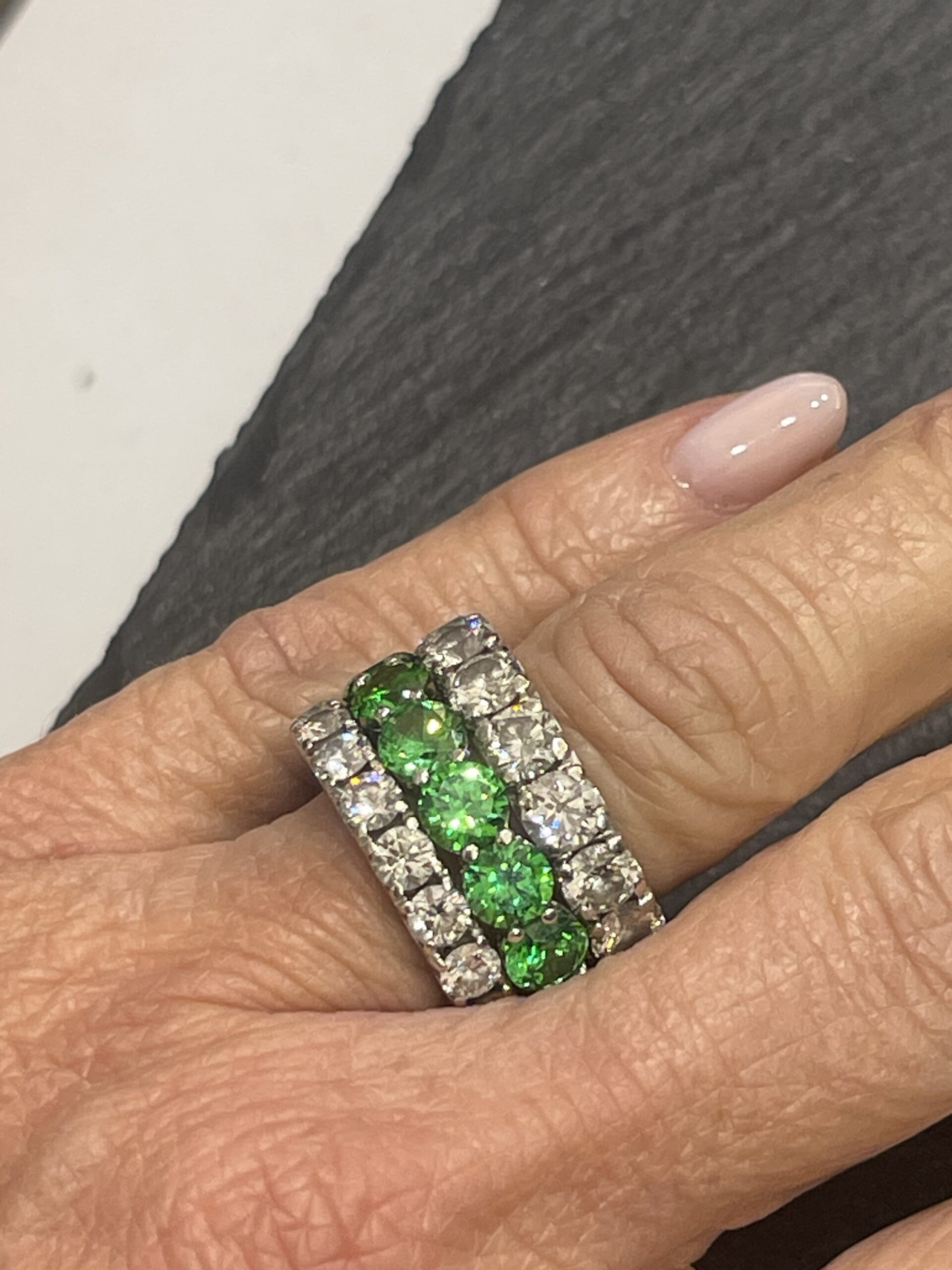Fedina oro bianco 18 kt tzavorite verde e brillanti fatta a mano mis 13