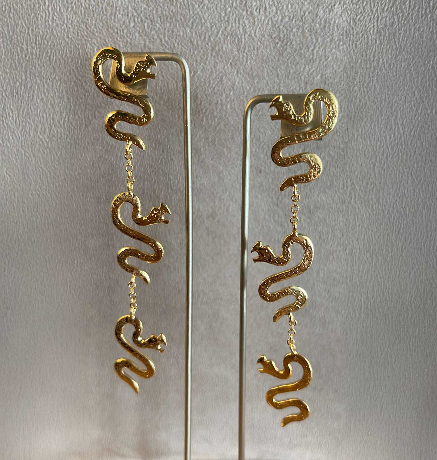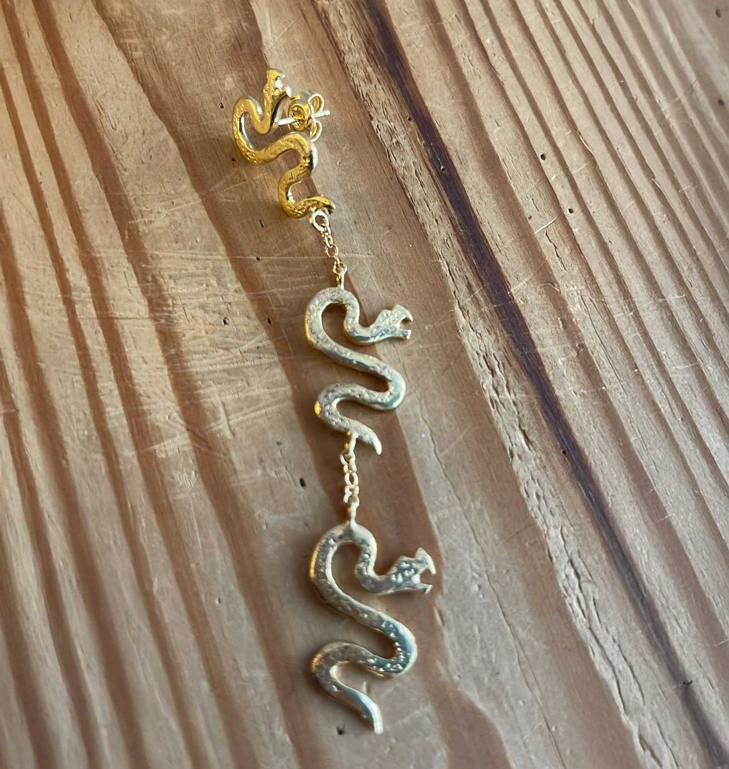 L’orecchino “Draghetto” è realizzato a mano in bronzo giallo con bagno in oro 18 kt, pensato per chi ama accessori originali e di carattere. Con una lunghezza di 9 cm, unisce forme decorative ispirate al mondo fantastico a uno stile fashion e deciso. Nickel free, leggero e confortevole, è perfetto da indossare singolarmente o in abbinamento asimmetrico con altri orecchini statement.